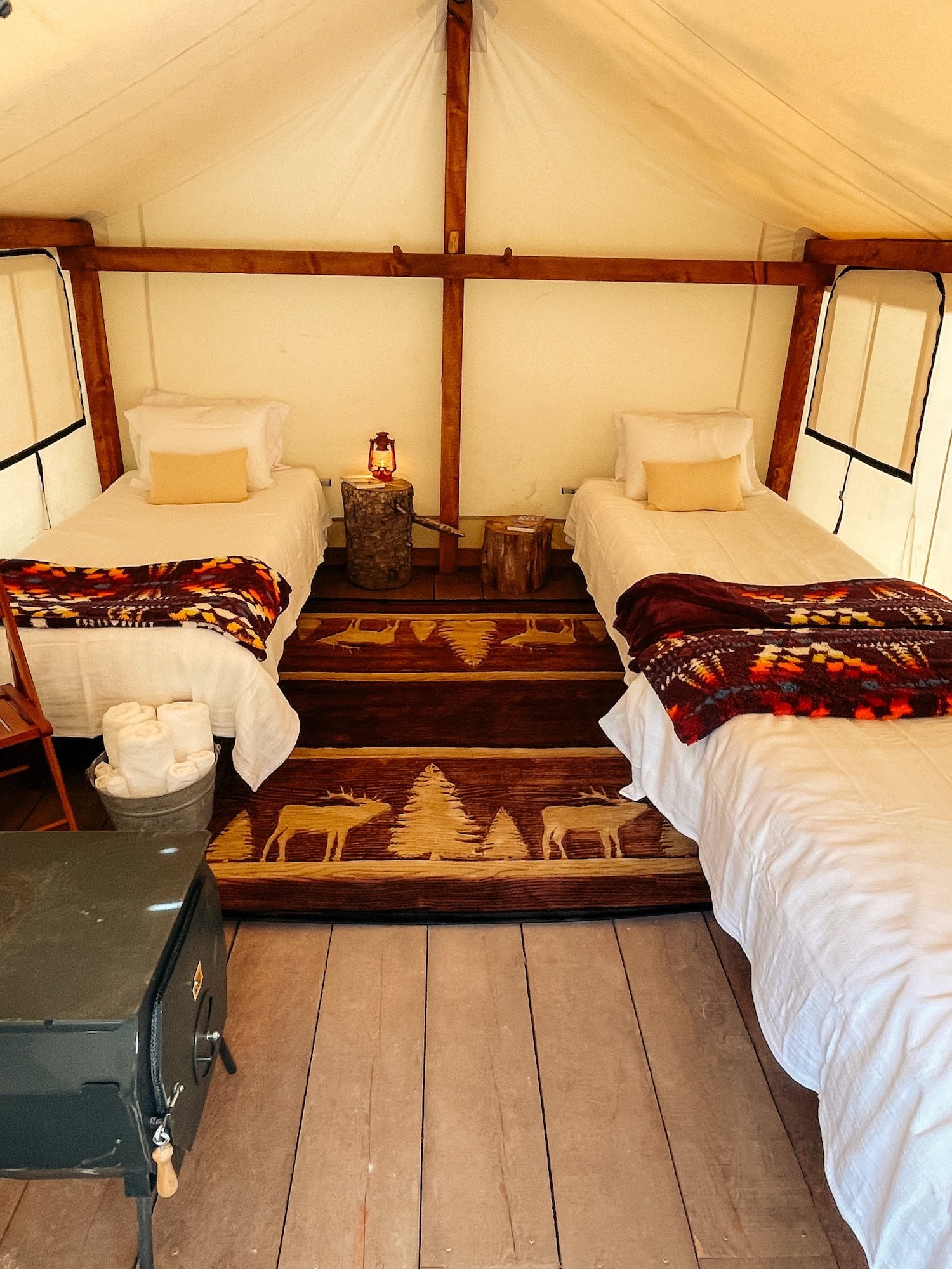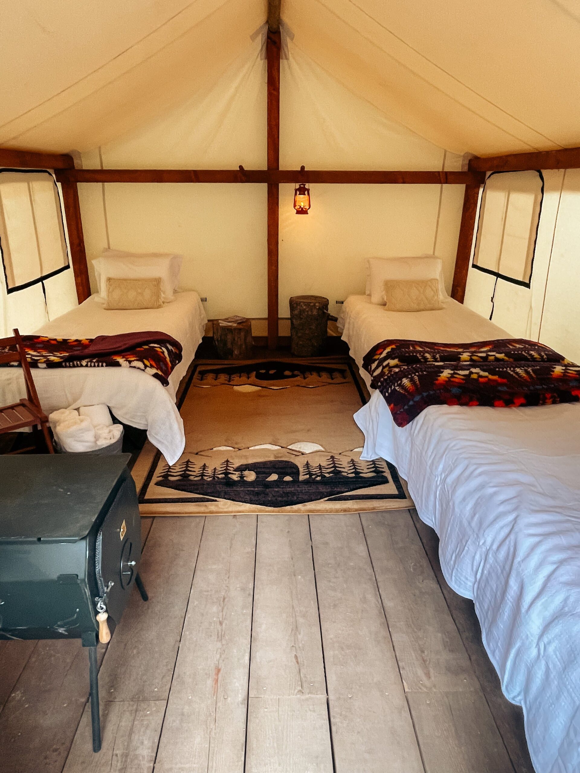 Each “glampsite” offers either queen beds or twin cots in each tent, and extra cots are available. The cots are oversized, and every bed is covered with a memory foam pad, fitted and top sheets, and top bedding. Quilts handmade by local seamstresses lay on each queen bed. There are also nightstands and chairs inside the tents.