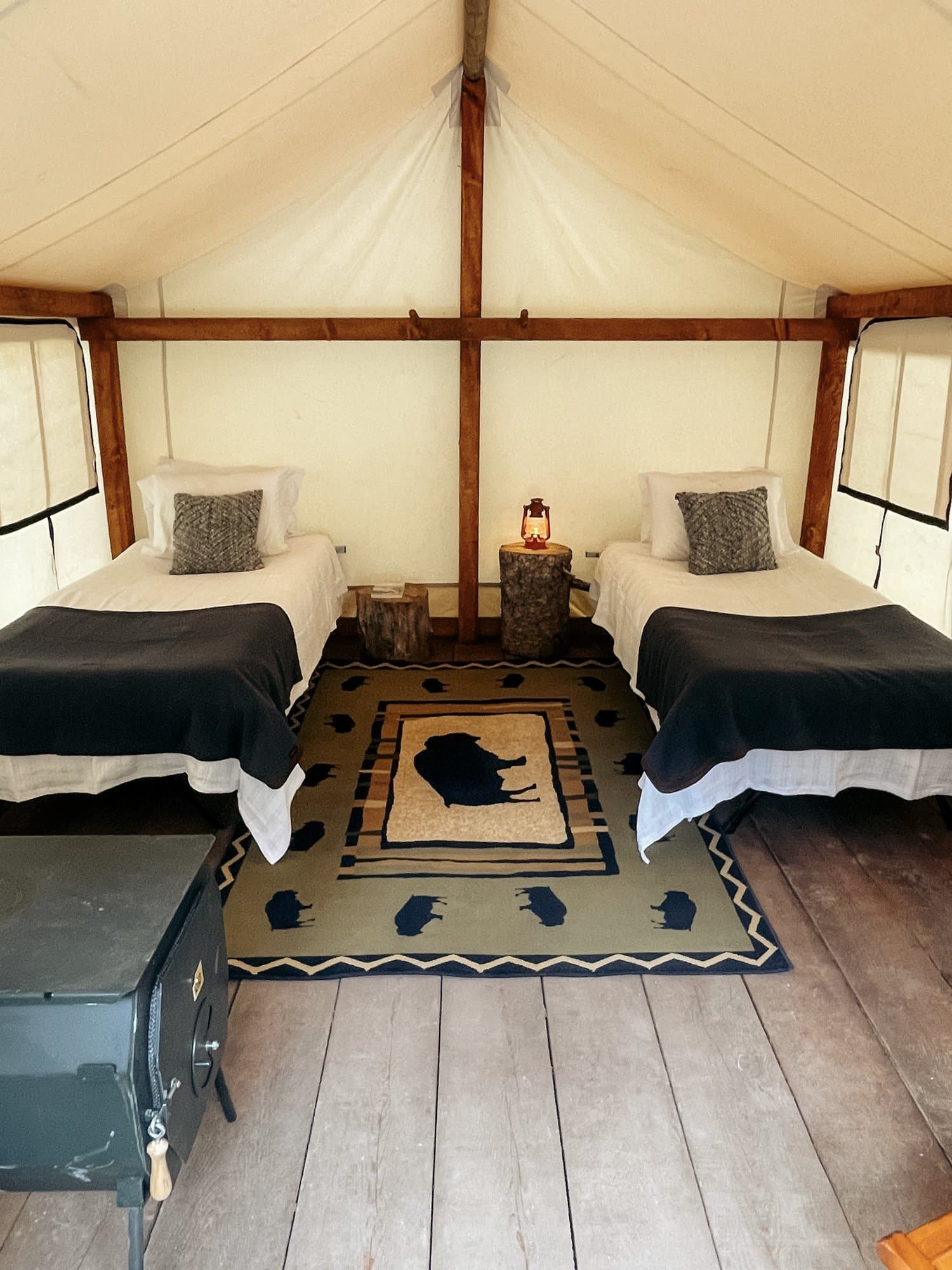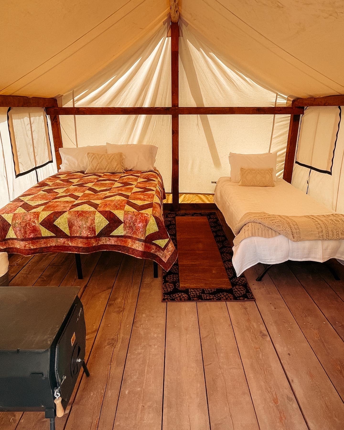 A canvas tent with a queen bed and one twin cot. This space typically holds three guests.